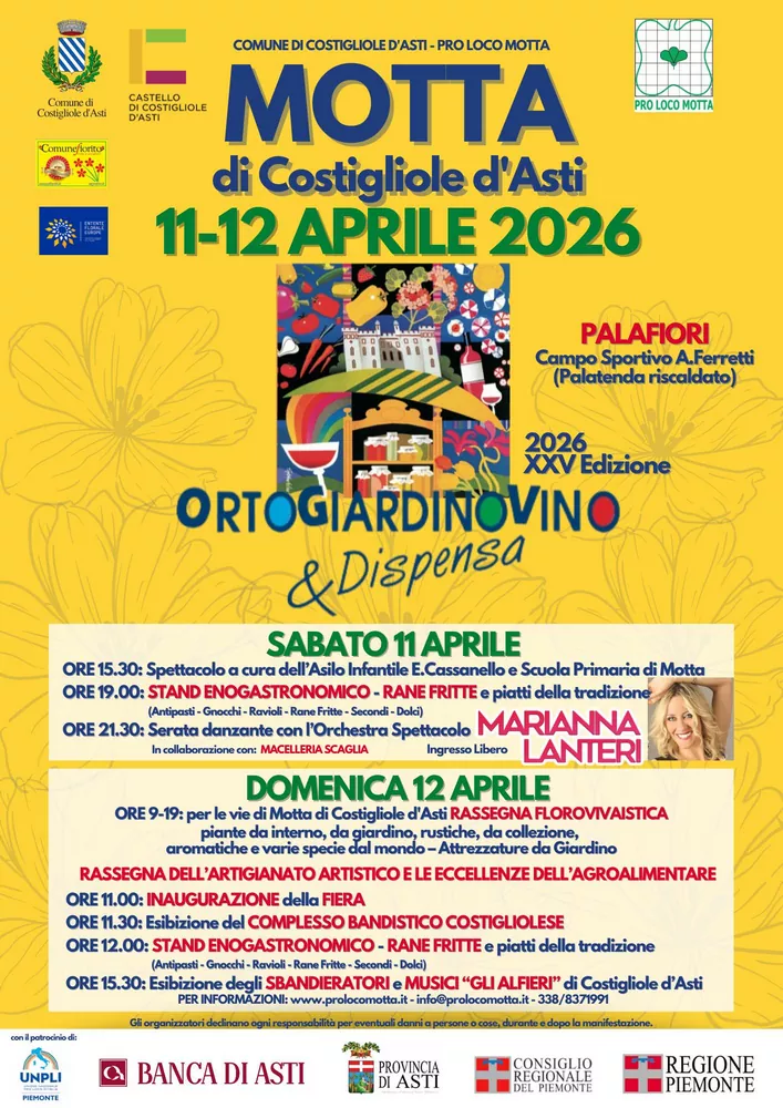 Sagra Orto, Giardino, Vino & Dispensa 2026 a Motta di Costigliole d’Asti: domenica 12 aprile, rassegna florovivaistica, artigianato locale e pranzo con le specialità della tradizione astigiana (rane fritte, gnocchi alla mottese). Ingresso libero.